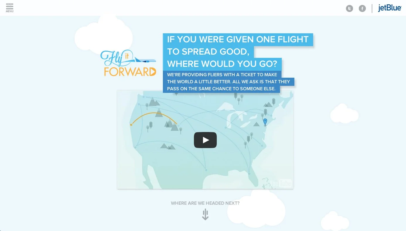 Flying it Forward is a human powered initiative where JetBlue provides one individual a free flight to help make the world a little better. When they arrive at their destination, that person selects the next individual to pass the ticket onto.